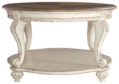 Elevating the art of traditional cottage styling, this oval coffee table is sure to serve you beautifully for years to come. Antiqued two-tone aesthetic blends a chipped white with a distressed wood finished top for added charm. Classic cabriole legs and shapely lower shelf are a lovely twist. Decorative corbels add refinement.