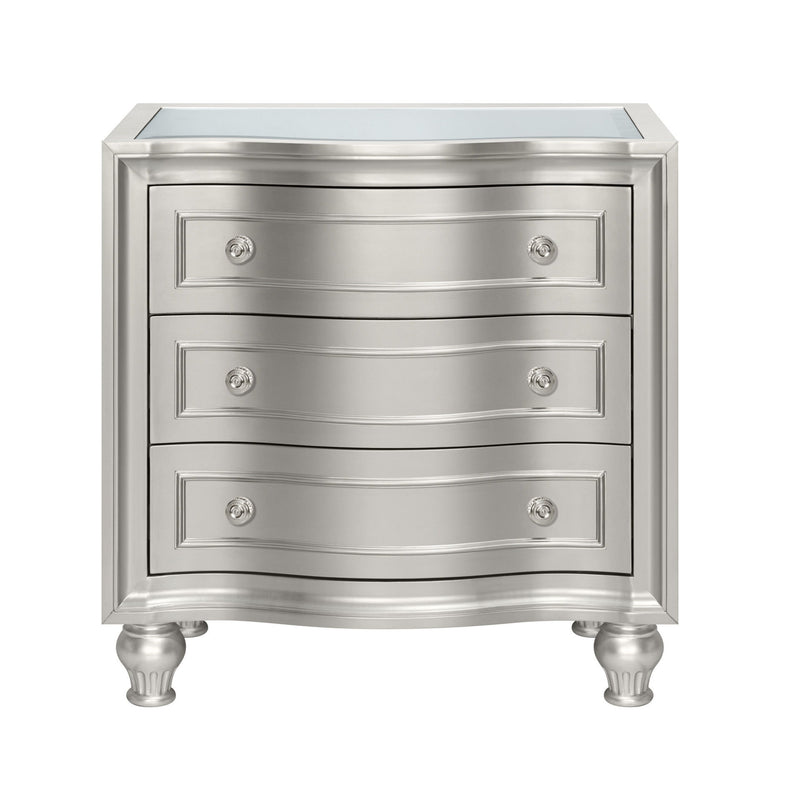 Introducing the Reflection Nightstand in Silver, expertly crafted from solid Pine and high-quality manufactured wood to ensure enduring strength and durability. Its glamorous matte silver finish exudes sophistication, accentuating the mirrored top and silver drawer pulls, adding a touch of elegance to any bedroom decor. Experience luxurious functionality with a mirrored top, bowfront drawers, sumptuous lavender velvet lining, picture frame moldings, and turned bun feet, seamlessly blending classic charm with modern flair. Inside, discover meticulous craftsmanship with English dovetail joinery, full extension drawer glides, finished interiors, and select velvet-lined drawers to safeguard delicate items. Enjoy extra upgrades such as the built-in USB charging port and cedar-lined bottom drawer, offering unparalleled convenience and lifestyle functionality. This nightstand is not just a piece of furniture—it's a marvel of design and practicality, destined to enhance your bedroom space with style and functionality.