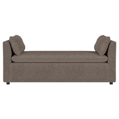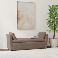 Create a chic spot for lounging or relaxing with a modern upholstered bench. With plush foam cushions and accent pillows, this backless design is ideal for a cozy primary suite or stylish living room. It features rubberwood framing for excellent durability, and is covered in dimensional brown upholstery. Its neutral palette is rich and refined, easily blending in myriad spaces and surrounding decors. The bench includes gently rounded arms that add a sense of structure, and a pair of accent pillows that add inviting softness.