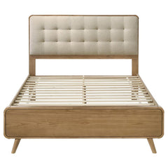 Bring countryside charm to your bedroom with this mid-century-inspired bed, expertly crafted from pine, engineered wood, and walnut veneer for durability and style. The upholstered headboard features thick padding and square tufting for a touch of elegance and comfort, while the sleek, low-profile footboard completes the refined silhouette. Rounded corners and tapered legs highlight the retro-modern design, and its elevated frame adds a clean, airy look. Perfect for creating a serene and stylish bedroom retreat.