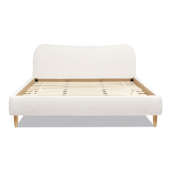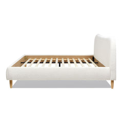 - Faux Boucle Upholstery: The bed is covered in faux sherpa-like boucle fabric, offering a cozy feel and adding an interesting texture to the piece.