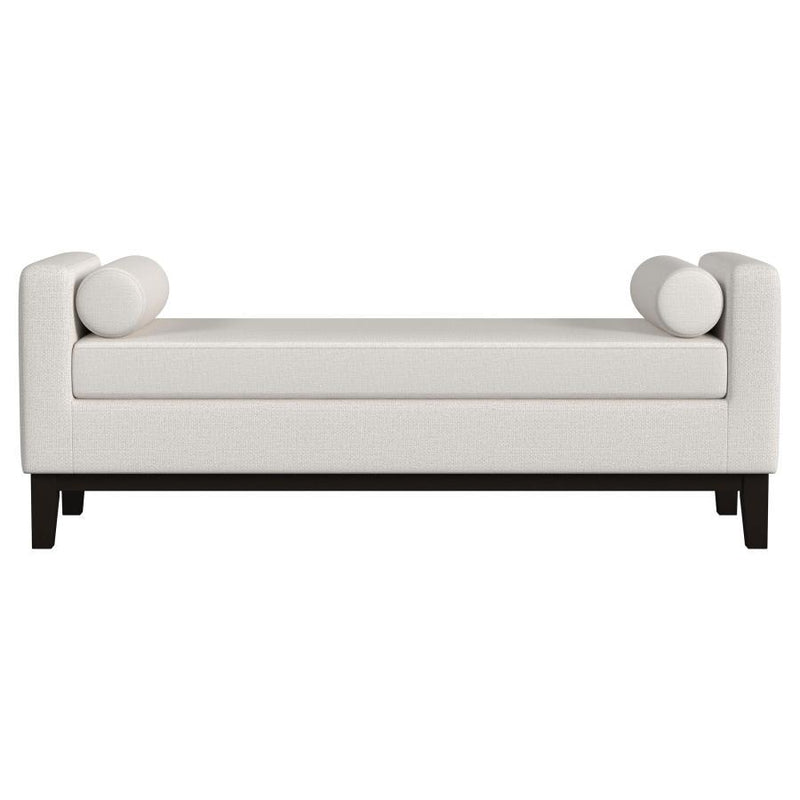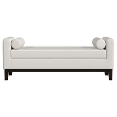 Complete a stylish, sophisticated living area or master suite with a modern upholstered bench. The backless design includes straight track arms, setting an austere silhouette. A pair of round bolster pillows soften the look and offer impeccable comfort and style. The bench seat cushion features foam fill, perfect for comfort in any space. The bench sits on a wooden bench and tapering legs, both receiving a black finish that creates lovely contrast and dimensionality.