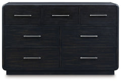 Inspired by art deco design, this softly shaped dresser makes a lasting impression in a simply stunning way. Its magnificent curved silhouette is enhanced by a rich layered black finish on the textured wood grain surface. This is the statement piece you’ve been dreaming of to elevate your contemporary inner sanctum.