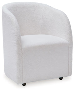 Inspired by art deco design, this fully upholstered dining chair makes a lasting impression in a simply stunning way. Its magnificent curved silhouette is enhanced with a neutral boucle upholstery that’s so pleasing to the palate. This is the piece you’ve been looking for to elevate your contemporary decor whether you’re dining, listening to your latest playlist or binge-watching with friends. Plus, it’s set on casters so it’s easy to move around.