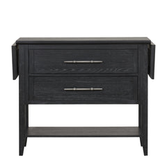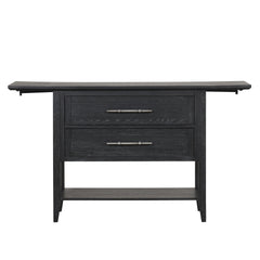 The Sable Crest Drop Leaf Server is a versatile and durable piece designed to enhance both the style and functionality of your dining space. Built from solid Rubberwood and premium engineered woods, and finished with real Oak wood veneers, it offers the lasting strength of real wood combined with enduring beauty. The sophisticated ebony sable finish, applied through a meticulous multi-step brush technique, highlights the natural grain and unique characteristics of the wood, adding depth to your dining area. The transitional design blends contemporary clean lines with subtle farmhouse charm, making it suitable for a variety of interior styles. This server is not only stylish but also highly functional, featuring two spacious storage drawers, an open shelf for easy access, and an extendable leaf that transforms it into a convenient buffet server. Its compact size and adaptable design make it perfect for use in entryways and hallways as well, offering a practical and attractive solution for any space that needs a touch of both style and utility.