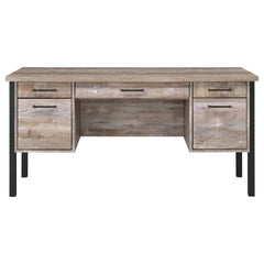 Infuse your office space with stylish simplicity. With a rustic, aged oak finish, this office desk exudes classic charm. Its strong silhouette is brought to life by crisp, clean lines of bold, black metal. Complete with five spacious storage and file drawers, this desk makes it easy to stay organized. Complete with euro glides and high-quality craftsmanship, it's the ultimate in durable practicality.