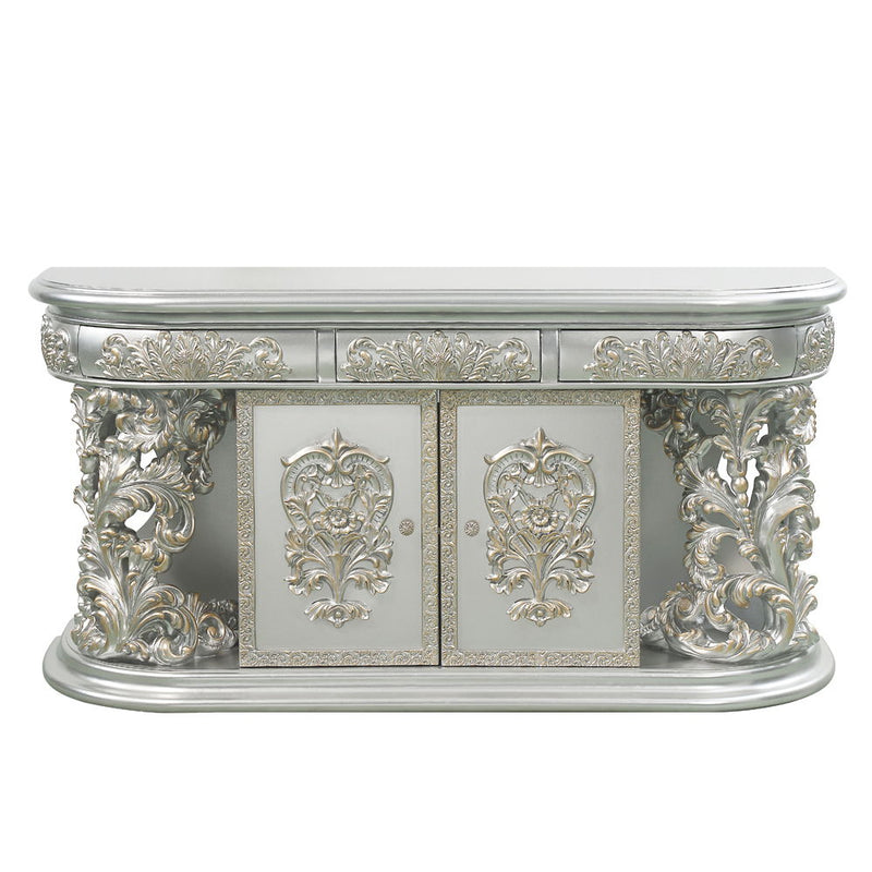 A luxurious antique silver finish with hand-brushed gold accents makes up the Sandoval dresser. Surrounded by fine Rococo scrolls and floral ornament crowns with stylized ribbons. Featuring three convenient storage drawers and two-door storage compartments. The base has an intricate open design for a modern appeal. The spacious table top has enough room for displaying jewelry and perfumes.