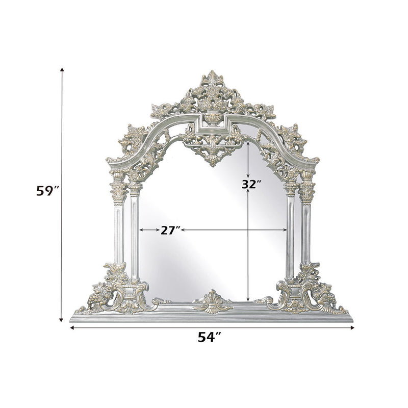 A luxurious antique silver finish with hand-brushed gold accents makes up the Sandoval mirror. Surrounded by fine Rococo scrolls and floral ornament crowns with stylized ribbons. Featuring an ample mirror that will make applying makeup and hair products convenient. This mirror can be used with the dresser or on its own as a hallway statement piece.