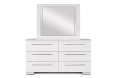 Upgrade your bedroom with the Sapphire Modern 6-Drawer Dresser in high gloss white. Expertly constructed from high-quality manufactured wood, this dresser features a flawlessly smooth, ripple-free surface and a glossy white laminate finish that offers a sleek, contemporary look. The white laminate enhances the modern design, providing a bright, clean appearance that complements contemporary interiors and is easy to maintain. Sleek chrome drawer pulls and silver mylar bases add a striking touch by catching and reflecting light. Inside, the spacious drawers are built with durable dovetail joinery and full-extension slides, ensuring ample storage and effortless access. This dresser combines sophisticated style with practical functionality, making it a perfect choice for a refined, modern bedroom.