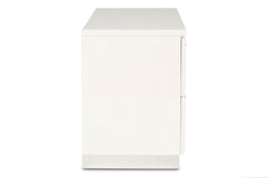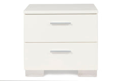 Enhance your bedroom with the Sapphire Modern 2-Drawer Nightstand in high gloss white. Constructed from high-quality manufactured wood, this nightstand features a smooth, ripple-free surface and a glossy white laminate finish for a sleek, contemporary look. The design is highlighted by elongated chrome drawer pulls and silver mylar bases that catch and reflect light, adding a striking modern effect. Inside, the roomy drawers offer ample storage with durable dovetail joinery and smooth full-extension slides for effortless use. This nightstand combines stylish design with practical functionality, making it a perfect addition to any contemporary space.