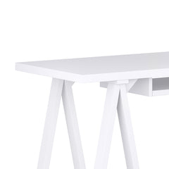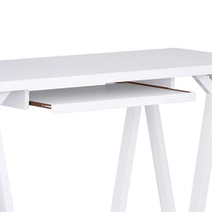 - Features a simple and wide, extra thick table top surface, integrated wood keyboard tray and sturdy sawhorse supports