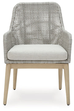 This dining arm chair invites your casual contemporary style outdoors. With its resin wicker in a chic neutral hue, it expertly marries refined design with durability. Breezy summer mornings and cold winter nights are made all the more comfortable with high-performance Nuvella+ fabric covering the seat cushion.