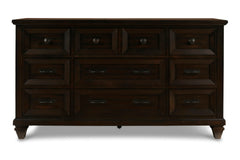 The Sevilla 9-Drawer Dresser in walnut is a masterpiece of timeless craftsmanship and versatile design, making it a stunning addition to any bedroom. Skillfully crafted from solid Acacia wood and Acacia veneers, this dresser features a rich, hand-distressed walnut finish that gives it a warm, vintage appeal. The dresser's sturdy construction and substantial presence command attention, while its elegant design blends traditional, rustic, and colonial styles, creating a cozy and inviting ambiance. The nine spacious drawers are equipped with masterful dovetail joinery and smooth interiors for snag-free storage, gliding effortlessly on precision-engineered, full-extension drawer glides. Thoughtful details include luxurious velvet-lined top drawers to protect your valuables and a removable jewelry caddy nestled in the top center drawer, adding both elegance and functionality. Perfectly balanced between style and durability, this dresser serves as a captivating focal point in any classic, cozy, or historically inspired space.