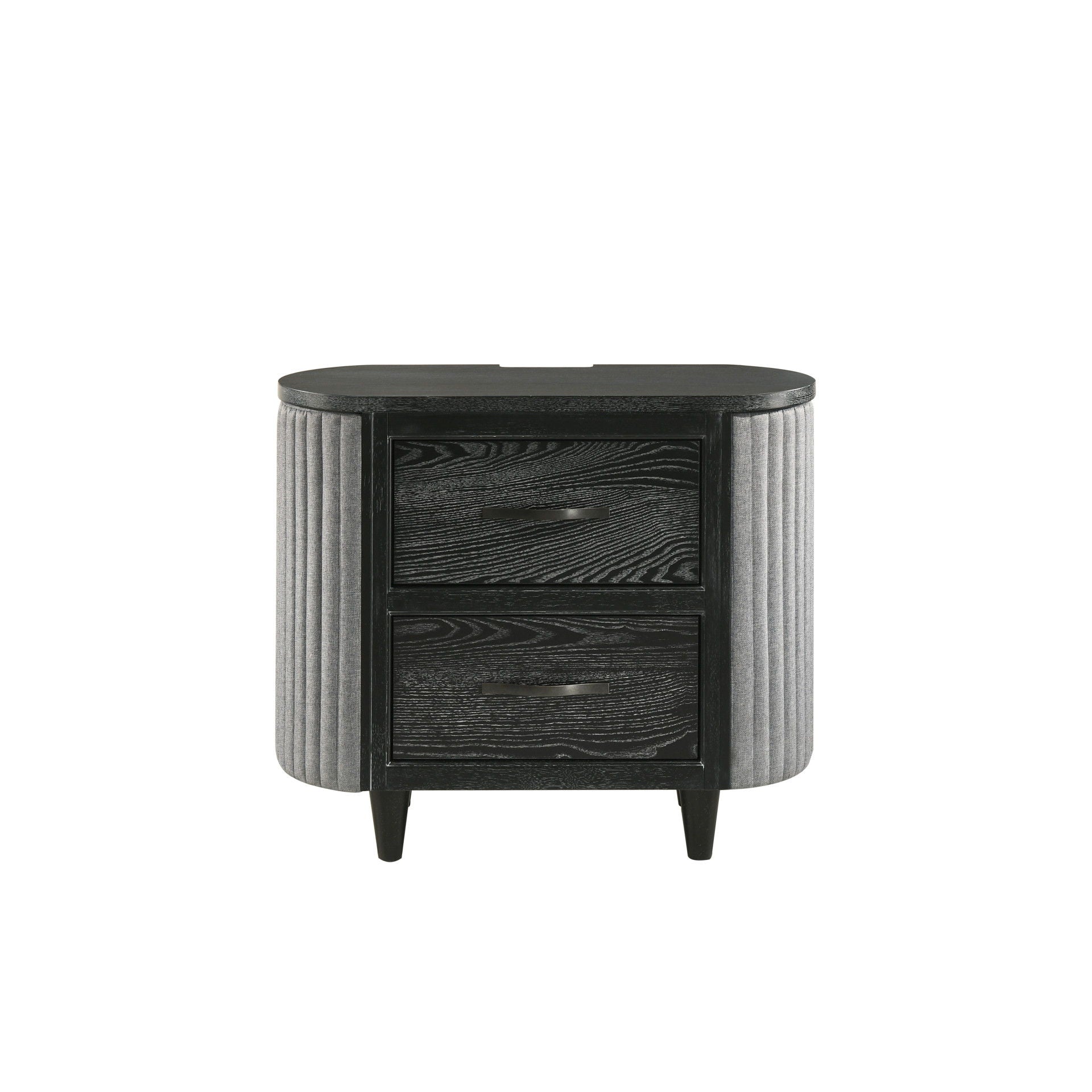 - Mixed Material Mastery: Textured gray ribbed fabric curves around each side of the nightstand, creating a striking contrast against the dark wood finish, adding visual intrigue while softening the overall look.