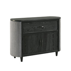 The Skyline Server in Onyx blends modern design with functionality, making it a versatile addition. Crafted from solid Rubberwood, engineered woods, and Ash veneers, it offers durability and style. The Onyx Black finish with gray glazing enhances the wood grain. Textured gray ribbed fabric contrasts elegantly with the dark wood. A spacious top drawer and roomy lower compartment provide ample storage. Ideal as a dining sideboard, entryway accent, or TV stand, it delivers lasting quality and appeal.