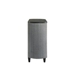 - Mixed Material Mastery: Textured gray ribbed fabric curves around each side of the chest, creating a striking contrast against the dark wood finish, adding visual intrigue while softening the overall look.