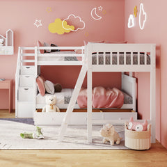 Twin Over Full L Shaped Bunk Bed With 3 Drawers, Ladder And Staircase - White