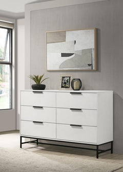 Fresh brings bright, contemporary appeal to a modern six-drawer dresser. Perfect for a refined or casual bedroom space, it features a melamine finish that's durable and resistant to damage, great everywhere from master suite to a kid's bedroom. Each drawer features a long finish bar pull that adds contrast. A matching black metal base elevates the dresser and creates an airy finishing touch. Use the top for decor that adds a personal touch to your bedroom.