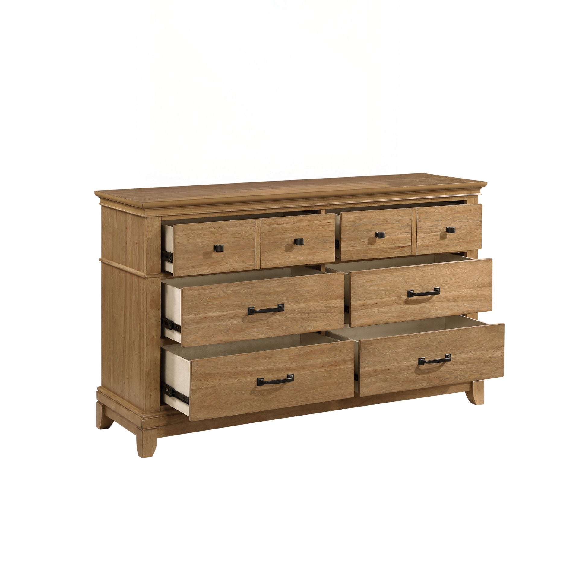 The Sunstone Dresser offers a durable, quality construction with solid rubberwood, manufactured woods, and hickory wood veneers, ensuring a strong and stable six-drawer dresser. This collection's versatile style features a classic, rustic design with natural wood finishes and clean, simple lines, creating a serene and inviting atmosphere. The clear, natural finish, achieved through a hand-applied stain, enhances the wood's grain patterns and characteristics. The dresser's elegant design includes a raised base, full return moldings, and contrasting hardware, adding a sophisticated touch to any bedroom. Heirloom drawer quality is ensured with durable dovetail joinery, providing longevity and strength, while three-stage steel ball glides allow for smooth, full-extension operation and support for heavy loads. Functional extras include six spacious drawers for ample clothing storage and velvet-lined top drawers to protect delicate items. The Sunstone Dresser combines timeless design and practical functionality, making it a valuable addition to your bedroom.
