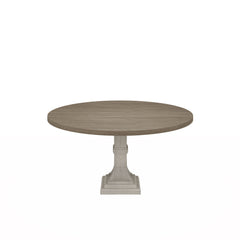 - Crafted for those who appreciate the finer details in their dining space, the Tannen Dining Table presents a harmonious blend of sophistication and rustic charm. This elegantly designed table features a generous 59" round tabletop that gracefully sits atop a sturdy white pedestal base, ensuring both stability and style. The natural grain variation across the table's surface adds an organic touch, beautifully contrasted by a distressed finish that brings an air of lived-in luxury to any room. This dining table promises durability and a timeless appeal, making it a perfect centerpiece for gatherings, meals, and memorable conversations.