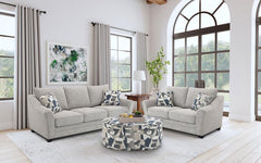 Geometric accent pillows add the perfect pop of pizzazz to a two-piece modern sofa set. Ideal for a stylish but approachable living room, the set features clean lines with sloping arms that add a hint of movement. Light gray upholstery complements in a contemporary space, while plush foam cushions are complemented with sinuous springs and pocket coils for exceptional support. The sofa and loveseat feature piped trim, adding to their tailored appeal. Tapered block feet in a finish complete the look and offer stability and durability.