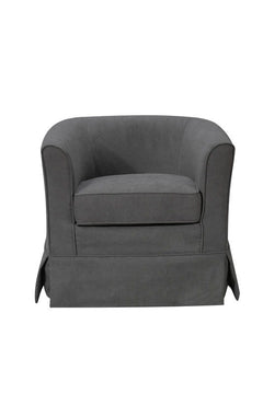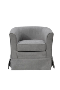 - Looking for an extra chair for your living space that is both stylish and comfortable? The Tucker swivel barrel chair makes the perfect addition. Featuring a swivel base with a curved back and armrest making it ideal to curl up and relax in. The skirted bottom cover conceals the metal base to maintain your dcor and its removable seat cushion is plus for easy cleaning.