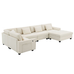 U Shaped Sectional Sofa 6 Seat Couch Set With Oversized Ottoman, Hidden Armrest Storage And Cup Holders USB Charging Ports Wide Seat Sofa - Off White