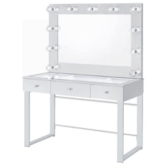 With a Hollywood regency flair, this modern vanity set features a stunning mirror paneled design that reflects surrounding hues. Cleverly designed with a clear tempered glass top that showcases cosmetics and accessories tucked inside the three drawers beneath, this vanity offers a unique functionality. Adorned on each of the three bright white drawers are crystal-like acrylic pulls, further lending to its dramatic glam flair. Mounted on the back is an oversized mirror framed in a mirror-like polished chrome metal finish, complete with a series of retro-inspired, Edison-style LED bulbs. Constructed with a heavy gauge steel base, this vanity set is made to last.