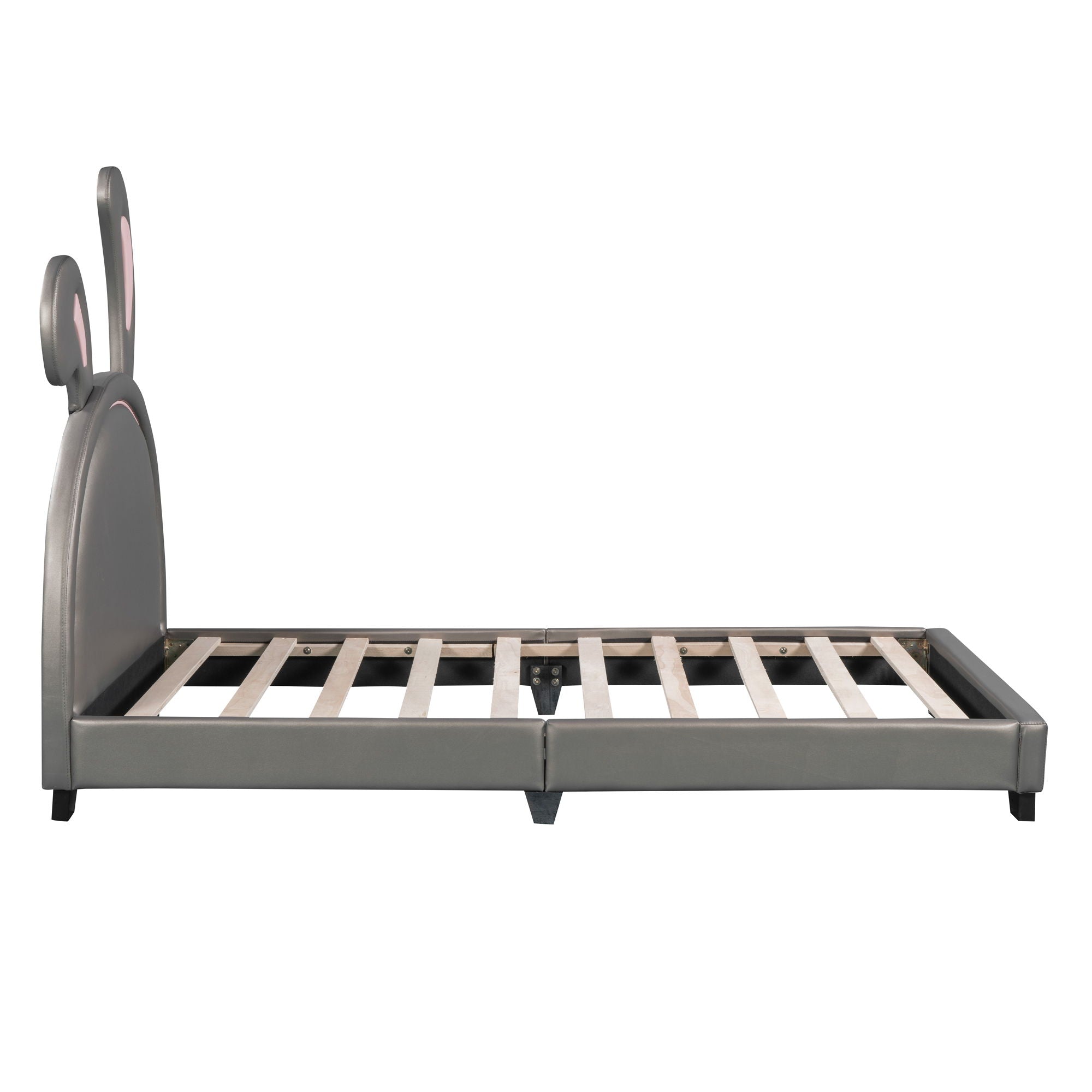 Twin Size Upholstered Leather Platform Bed With Rabbit Ornament - Gray