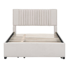 Full Size Upholstered Platform Bed With 2 Drawers And 1 Twin Size Trundle, Classic Headboard Design - Beige