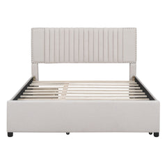 Queen Size Upholstered Platform Bed With 2 Drawers And 1 Twin Long Trundle, Classic Headboard Design - Beige