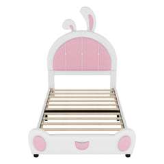 Twin Size Upholstered Platform Bed With Rabbit Shaped Headboard - White / Pink