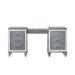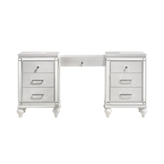 Introducing the Valentino 7 Drawer Vanity Dressing Table—a masterpiece of enduring craftsmanship crafted from a blend of manufactured and solid woods, adorned with exquisite embossed inlays. Revel in its glitz and glam, featuring a gleaming finish, mirrored trims, crystal-studded drawer pulls, and alligator-embossed accents that exude Hollywood allure. Delight in its thoughtful details, from heirloom-crafted English dovetailed drawers with snag-free interiors to smooth full-extension ball-bearing glides. With an abundance of storage, this vanity table offers ample space to organize cosmetics and accessories, including a luxurious velvet-lined drawer for jewelry. Transform your beauty routine into a glamorous experience with this exquisite piece—a true reflection of style and functionality.