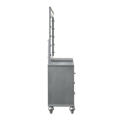 The Valentino Vanity is a stunning addition to any bedroom or dressing area. Made from a combination of manufactured and solid woods with decorative embossed inlays, this set ensures long-lasting quality and distinctive style. The gleaming finish, mirrored trims, crystal-studded drawer pulls, and alligator embossed inlays evoke a Hollywood glam appeal. The seven-drawer vanity table provides ample storage for cosmetics and accessories, including a velvet-lined drawer for jewelry, making it as practical as it is stylish. This exquisite vanity set seamlessly combines functionality with a touch of star quality, bringing an elegant and glamorous touch to your space.