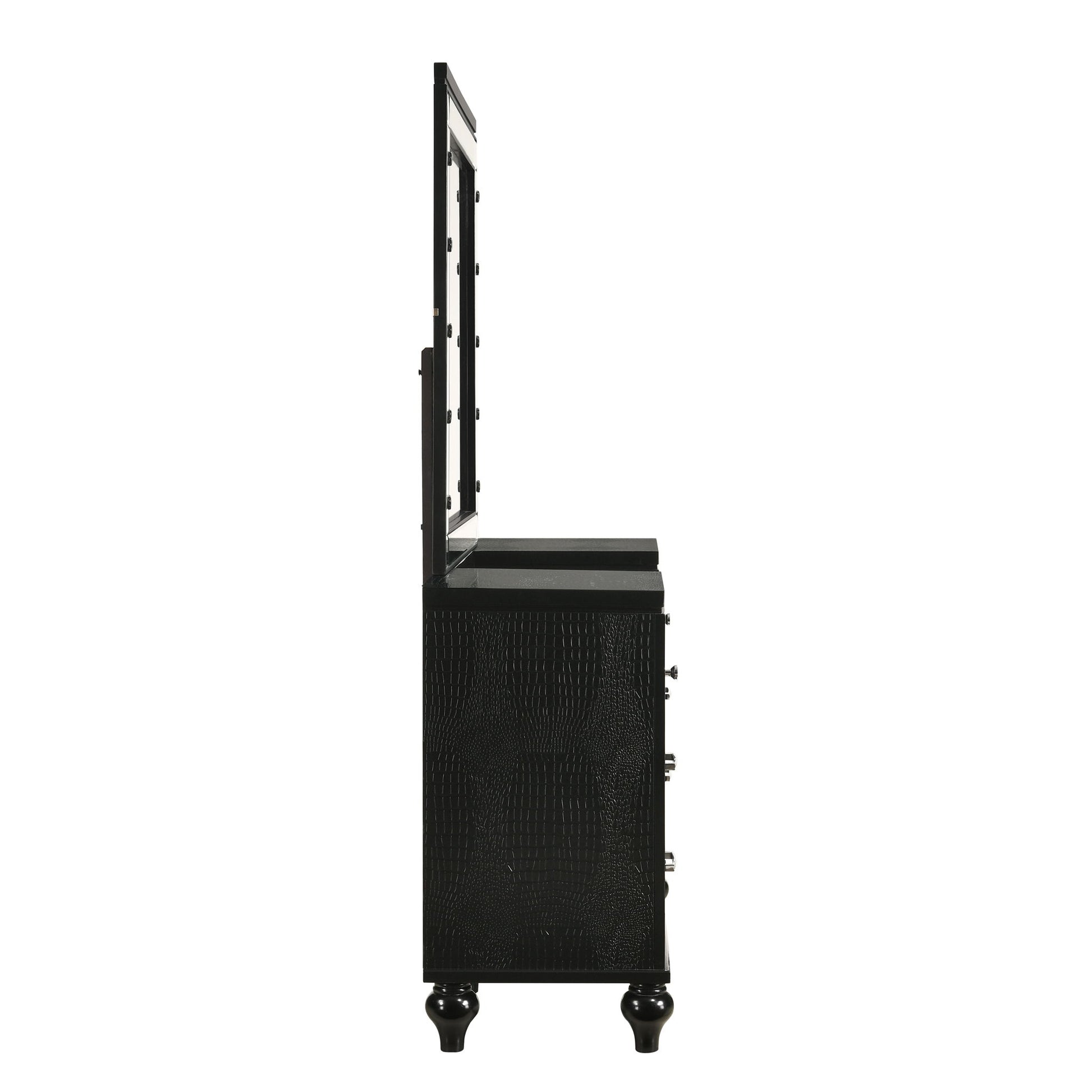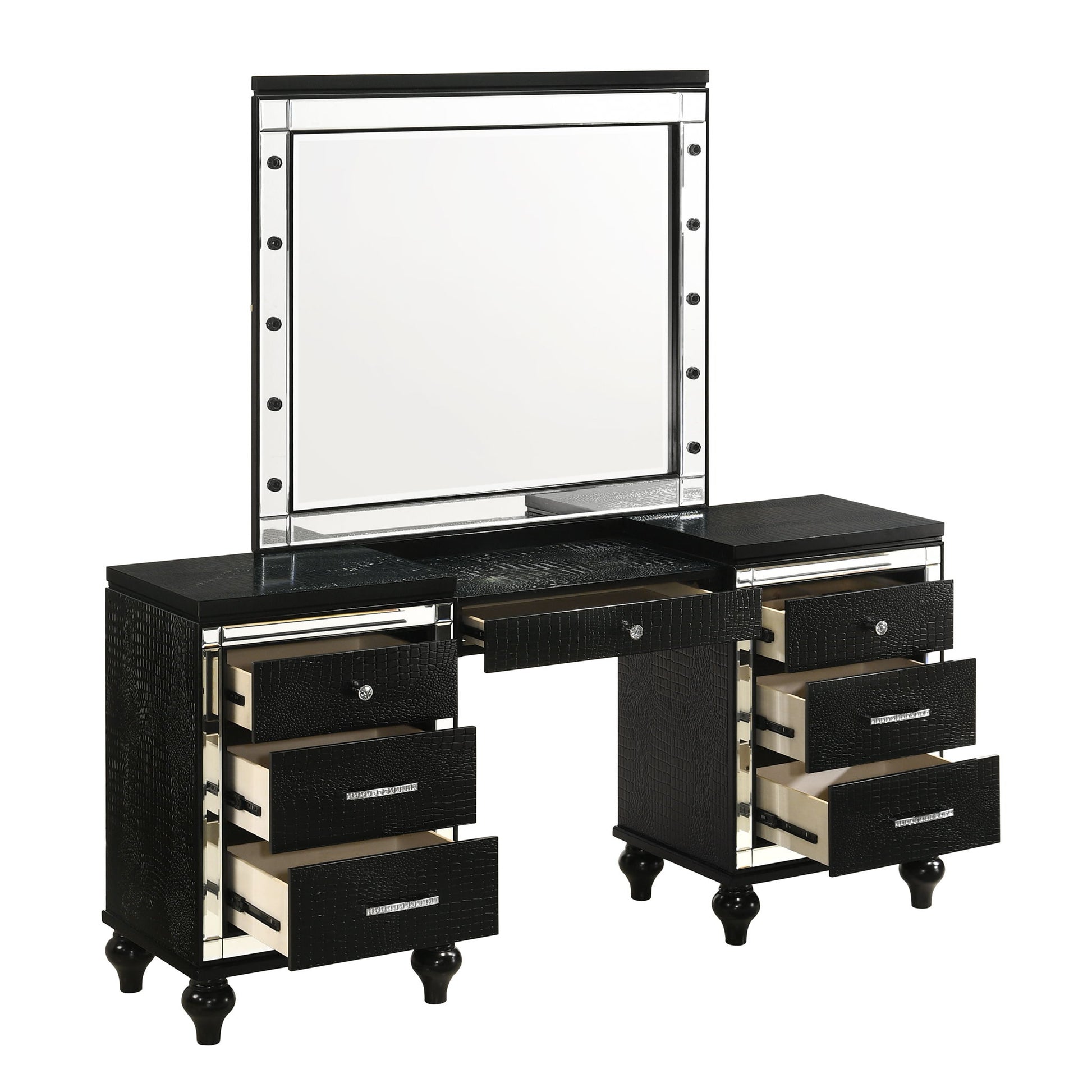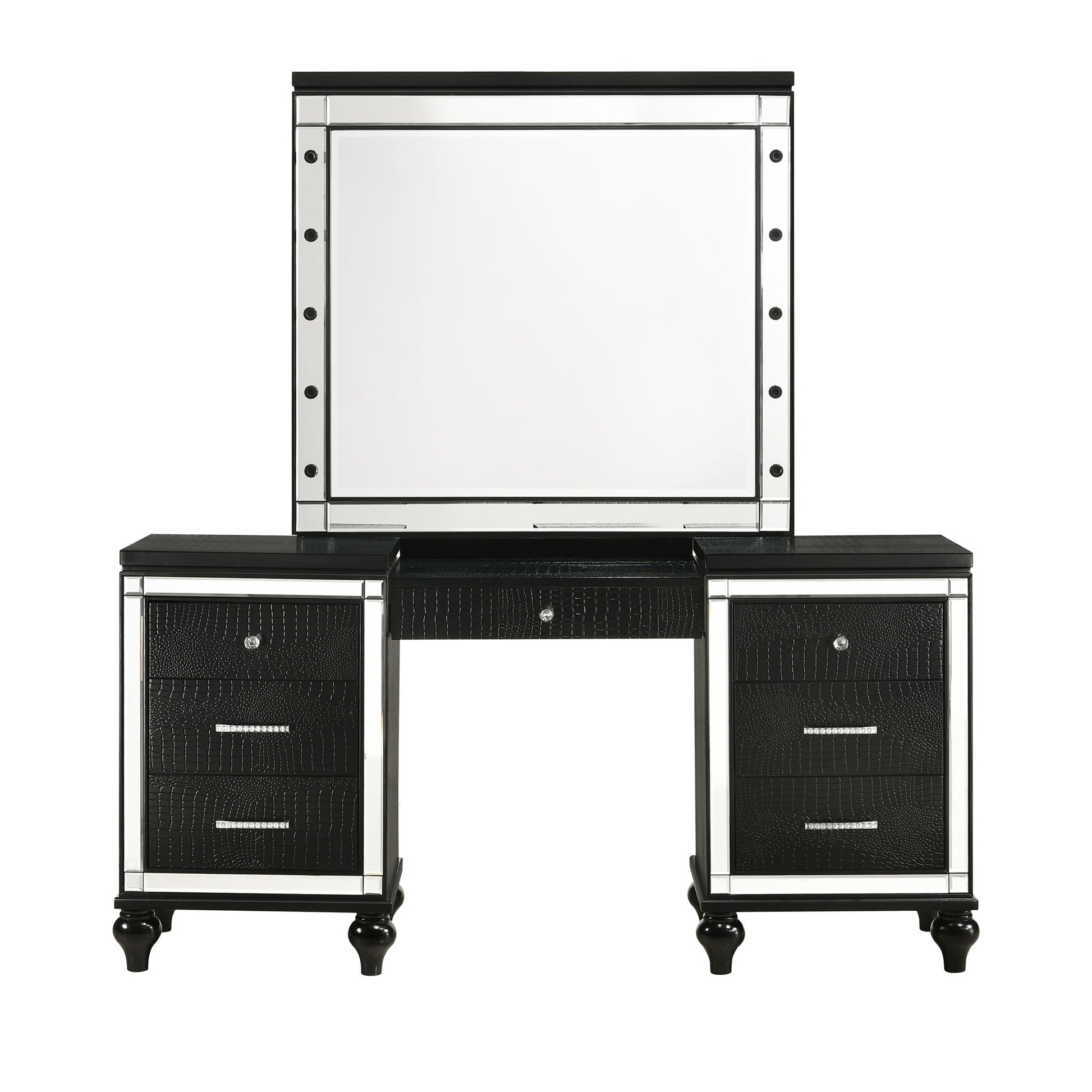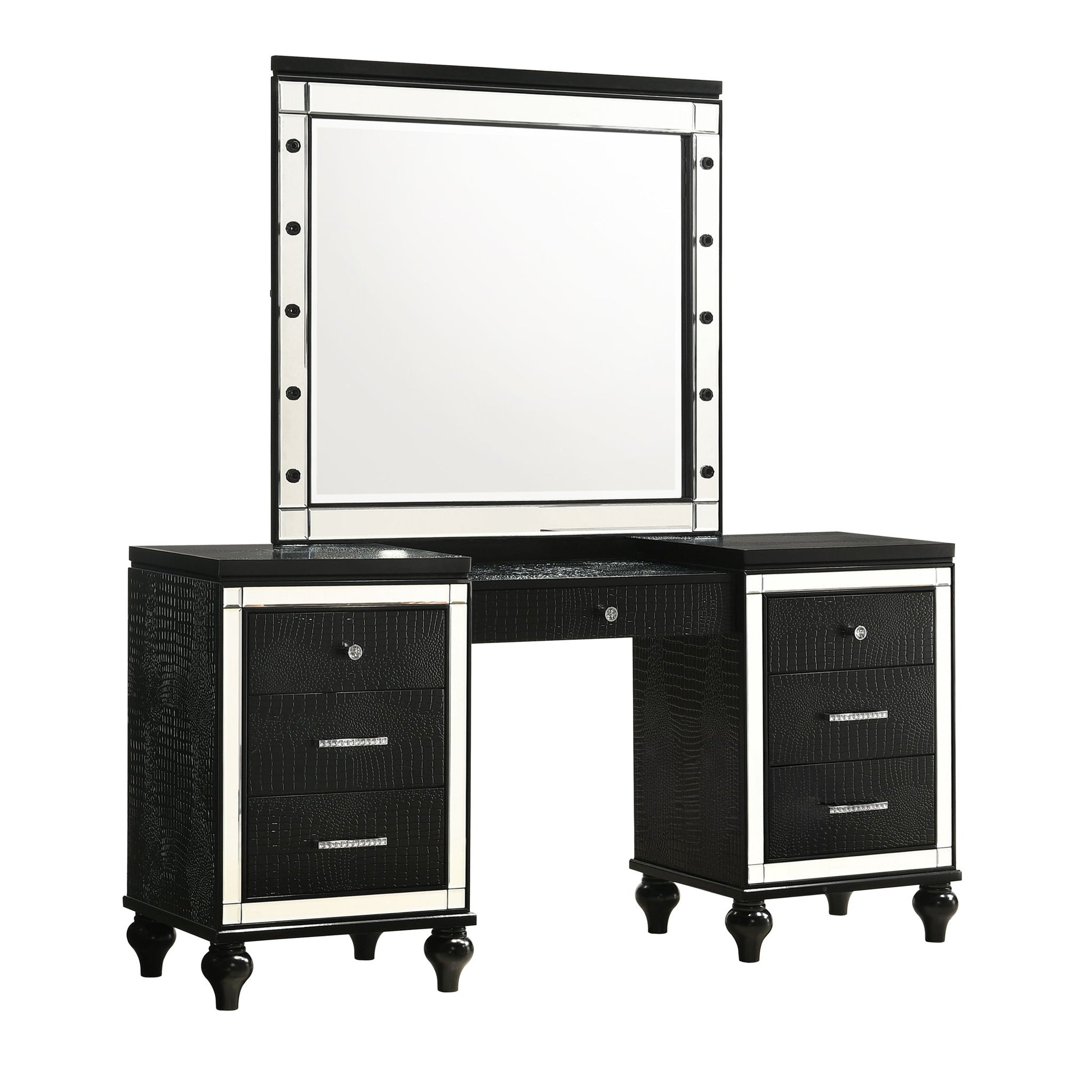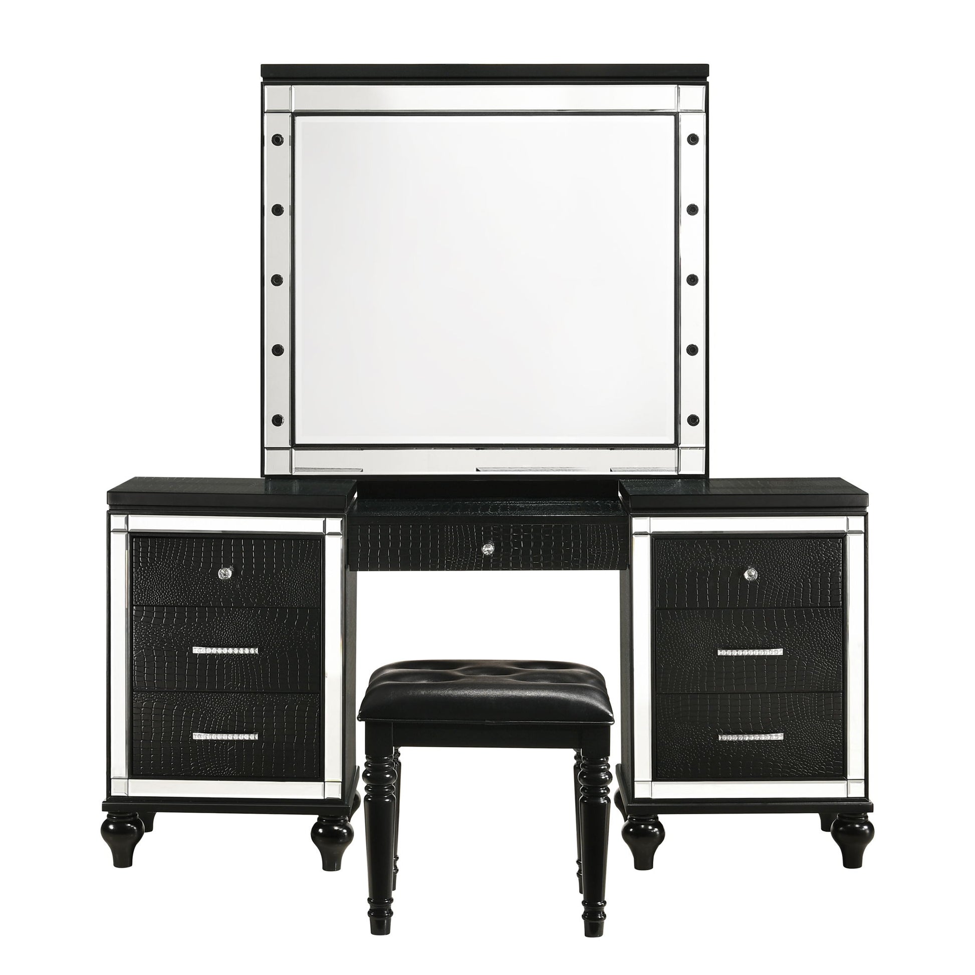 The Valentino Vanity is a stunning addition to any bedroom or dressing area. Made from a combination of manufactured and solid woods with decorative embossed inlays, this set ensures long-lasting quality and distinctive style. The gleaming finish, mirrored trims, crystal-studded drawer pulls, and alligator embossed inlays evoke a Hollywood glam appeal. The seven-drawer vanity table provides ample storage for cosmetics and accessories, including a velvet-lined drawer for jewelry, making it as practical as it is stylish. This exquisite vanity set seamlessly combines functionality with a touch of star quality, bringing an elegant and glamorous touch to your space.