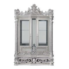 See the extravagant style and classical design all over the Valkyrie Dining Room Collection. Bold, intricate scrollwork accent is highlighted throughout each piece in this collection. Antique Platinum Finish paired with muted gray tone brings attention to its gorgeous details. Rectangular dining table showcases a timeless pedestal-style silhouette while matching chairs feature button-tufted upholstery for lavish comfort. Bring a dramatic change to your home with the Valkyrie Dining Room Collection.