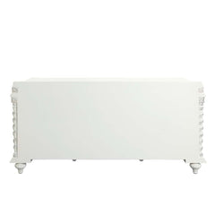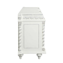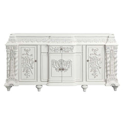 Sophisticated luxury radiates beautifully in the Vanaheim Dining Room Collection. Fabulous floral design with gorgeous details in each piece makes the collection classical and timeless. Antique white finish gives the surface an alluring feel and elegant touch. A clear glass dining table top allows light to filter into and through the whole table, enhancing the collection's overall design. Upholstery side chairs feature elaborate button-tufted design for adding extra style and comfort to the collection. This extremely extravagant style will make any ordinary dining room appear much more unique.