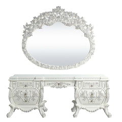 Luxurious style, sophisticated charm, and lustrous finishes are all included in the Vanaheim Bedroom Collection. Extravagant scroll floral design with gold trim accent creates classic appeal and timeless silhouettes. Button tufted headboard and footboard add texture and dimension to the panel bed. The matching casegoods in an antique white finish echo the overall design of the collection.'With so many irreplaceable characters, the Vanaheim Bedroom Collection will work beautifully in a variety of other spaces.