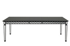 KD, Rectangular Leg Table, NO Storage, Extension Top(1 x 18" Leaf) Wooden Top Apron, Raised Geometric Apron Trim, Beveled Mirror Inlay, Tapered Leg; CONSTRUCTION - Wooden TOP: Wood (Poplar+Rbw), MDF, Poly-Resin, Mirror, APRON: Wooden+Mirror (Raised Geometric Trim) Wooden Tapered Leg w/Mirror Inlay