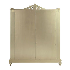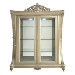 The Vatican Dining Room Collection brings dreamy romantic accents in classic design into your traditional dining room. Intricate trim features vigorous curves of scrolling vines and floral elements, while a champagne gold finish adds a touch of opulence and sophistication. The collection boasts glass dining table top and curio doors that reflect the light back into the dining area for an airier and lighter vibe. Deeply inviting, the matching dining chairs offer button tufted back and padded seat. Treat your guests to lavish warmth and comfort with the Vatican Dining Room Collection.
