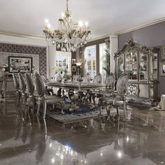 Irresistibly inviting, the Versailles collection displays the unrivaled beauty of the traditional dining. The dining table reflects highly decorative base with oversized scrolled feet, and the upholstered and tapestried chairs with deep button tufted and Nailhead trim accents add classic character and represents luxurious detailing. This collection offers three styles of tables and two finishes for you to choose, and it would be perfect for any formal dining room.