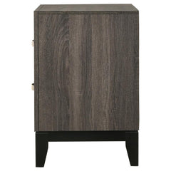 A contemporary take on mid-century modern design, the color blocking from this grey two-drawer nightstand sets it apart from the rest. Constructed of oak, the body showcases a light, exposed wood grain that oozes sophistication. Tapered legs in a black finish offer a modern feel, adding visual intrigue with neutral hues. Bright and metallic, light drawer pulls curve off the flat drawer fronts in a half moon shape. Complete a retro motif, or add fun flair to an up-to-date scheme.