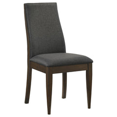 Dress up your modern dining room with this retro-inspired dining table set. Dine along the spacious rectangular table top, accented with fluted apron details and a bullnose edge for a touch of texture. Flared legs extend outward in dramatic fashion with a side brace between them. Designed in a gorgeous finish, this dining table set offers a rich color palette for discerning tastes in home decor. A set of matching side chairs complete this dining room table package, each with an elegantly contoured backrest, padded on each side, and a padded seat cushion, all of which are upholstered in a soft fabric for elevated dining experiences.