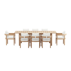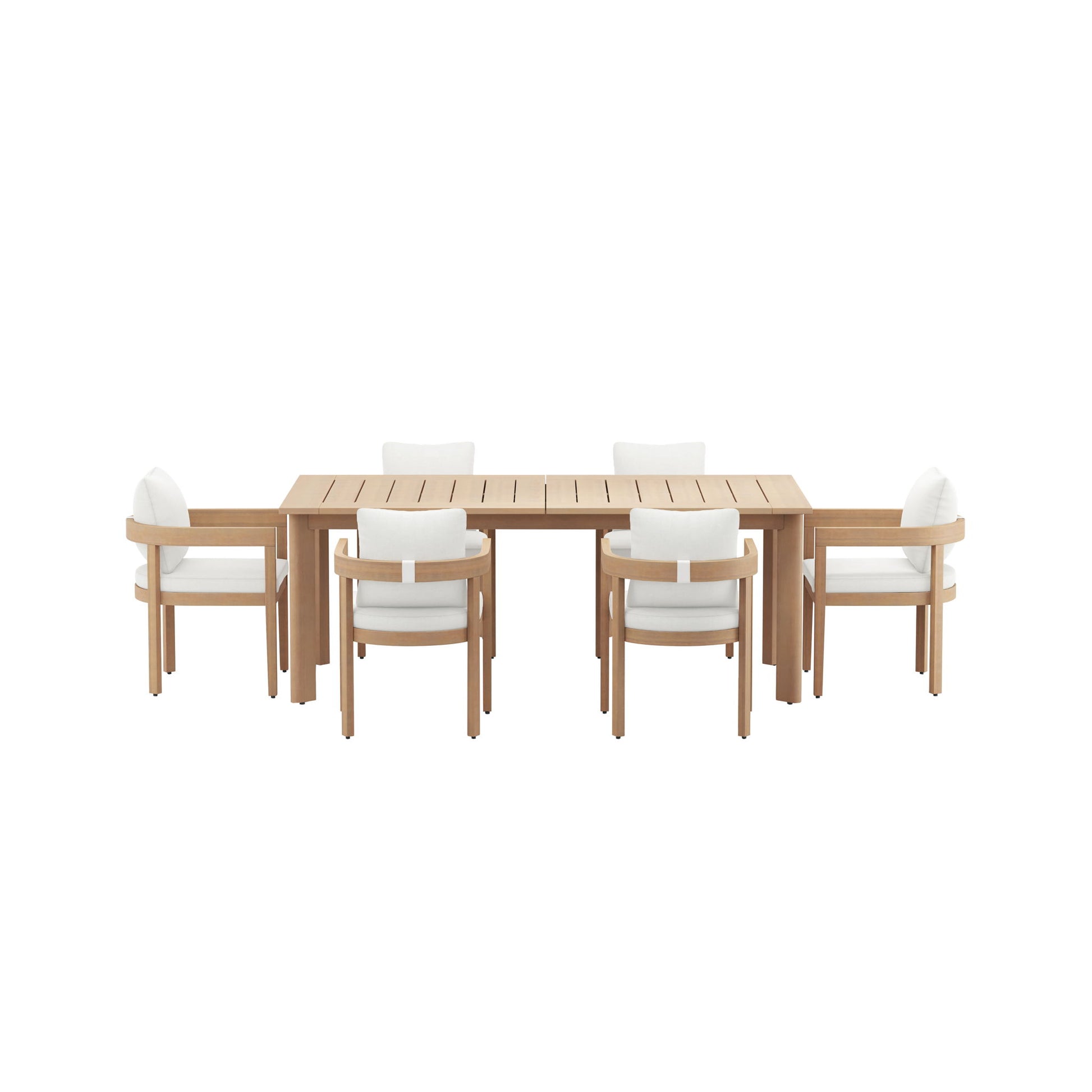 The Wesley Wood Patio Dining Set brings together comfort, durability, and style to create a warm, inviting space for outdoor gatherings. This set includes an extendable dining table and cushioned chairs, all crafted from FSC-certified Acacia solid wood, designed to last through every season. The rich wood grain is highlighted by a clear, smooth finish, adding a touch of natural beauty while standing up to the elements. The table’s classic slatted top not only adds character but also ensures quick water drainage, so it''s ready for any weather. For added comfort, each chair features plush, high-density foam cushions wrapped in Sundura™ fabric that resists fading and moisture, keeping them fresh and vibrant. With the table’s built-in leaf, you can effortlessly extend it from 78" to 96.5", creating plenty of room to comfortably seat up to eight people—perfect for relaxed family dinners or festive outdoor celebrations. The Wesley''s clean lines and gently rounded edges create a welcoming, laid-back vibe that makes every gathering feel like a special occasion.