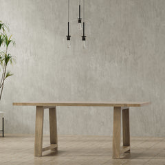 - Supporting the tabletop are extra-thick, solid wood legs with a trapezoidal shape.