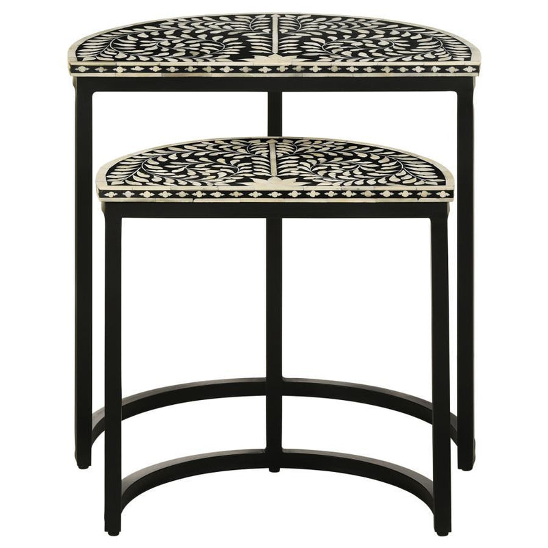 Artisan and exotic describes this elegant nesting table set with two tables that bring pure style to any living space. The Zakiya two-piece nesting table set conquers your serving needs while adding a bold and exquisite aesthetic. Set up a living room to entertain in full with these tables that feature gorgeous crafting with black finished iron forming clean lines and a semi-circle base to each table. The ornate detail of a black and bone inlay half-moon tabletop stands out to be noticed with a busy yet nature-inspired pattern. Set these tables apart as separates or close together for a larger serving space, and slide one under the other between use.