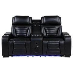 Designed for modern comfort and convenience, this dual power loveseat blends technology with bold styling. Power recline and adjustable power headrests offer personalized relaxation, while the center console features a lift-top compartment, two cup holders, and a built-in Bluetooth speaker for seamless audio. Finished in sleek black leatherette with dramatic LED under glow, it brings smart design to any contemporary lounge or home theater.